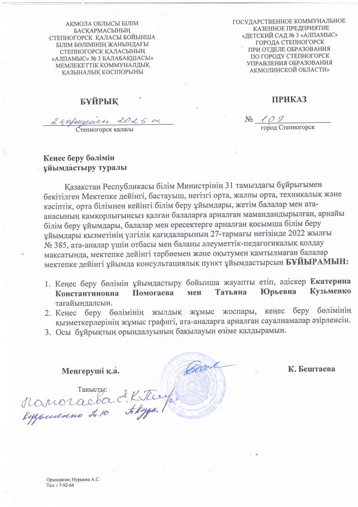 2025-2026 оқу жылына консультациялық пунктің жұмыс бұйрығы