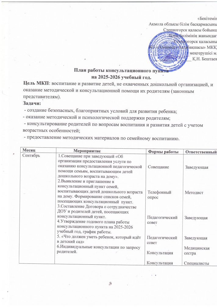 2025 - 2026 ОҚУ ЖЫЛЫНЫҢ КОНСУЛЬТАЦИЯЛЫҚ ПУНКТІҢ ЖҰМЫС ЖОСПАРЫ