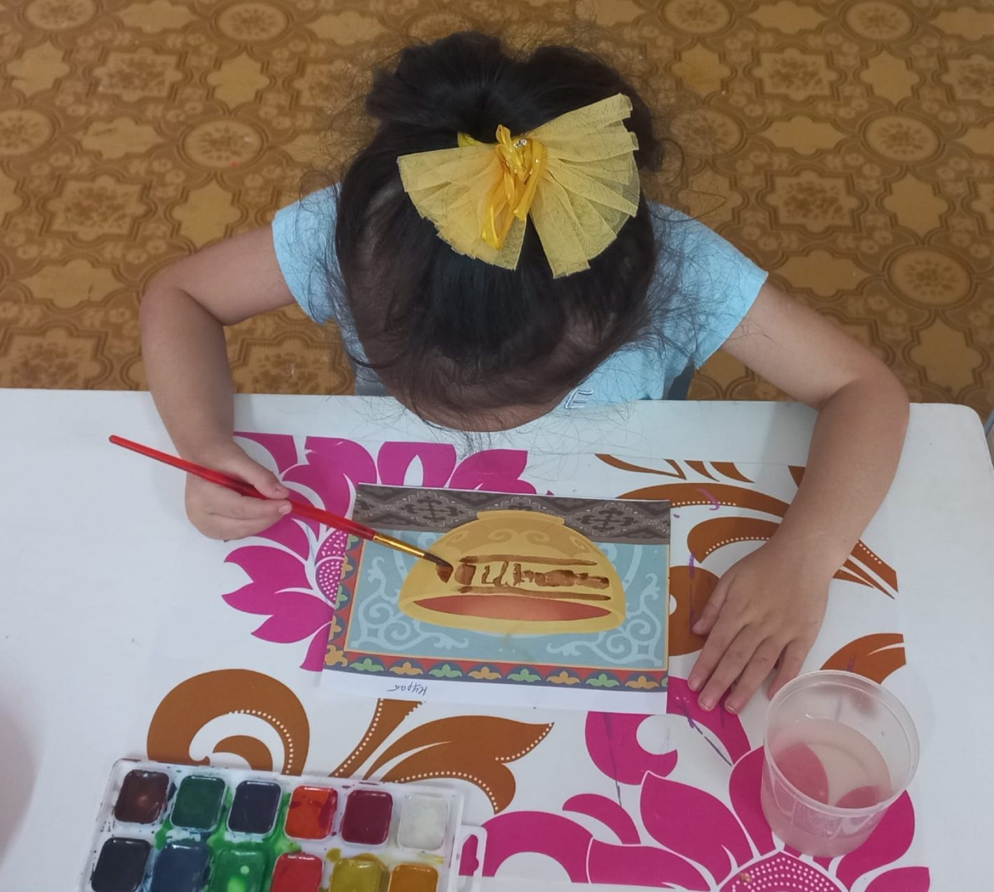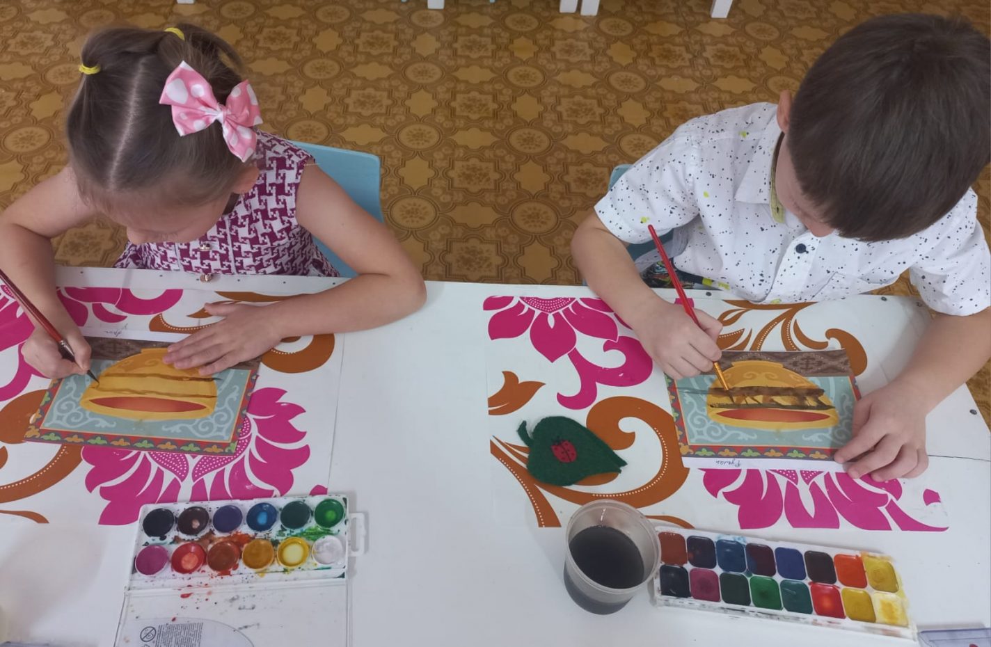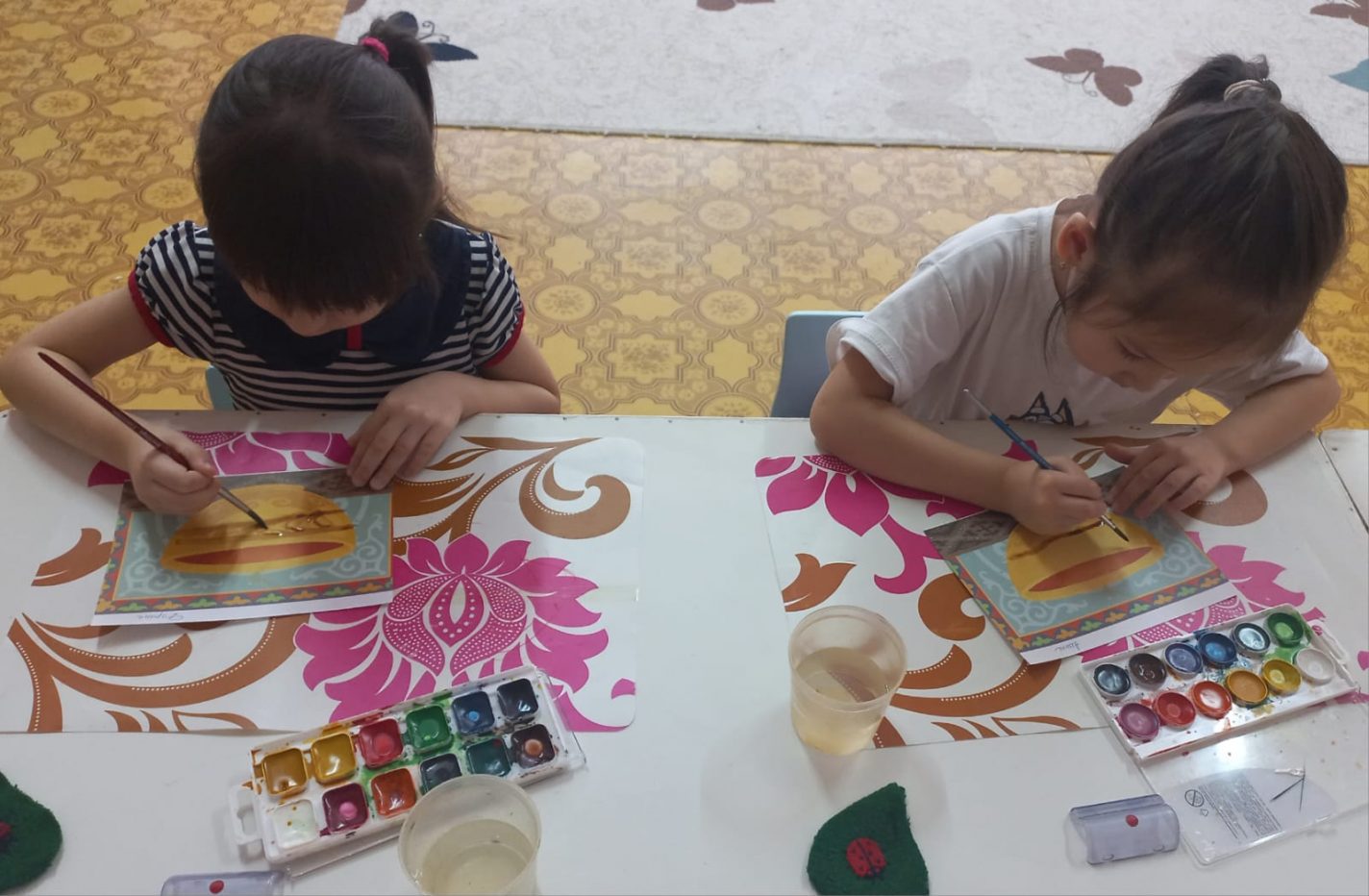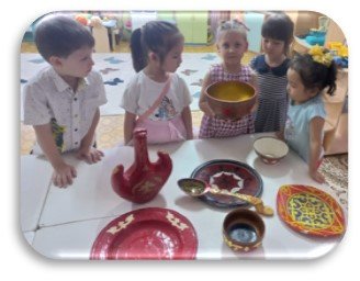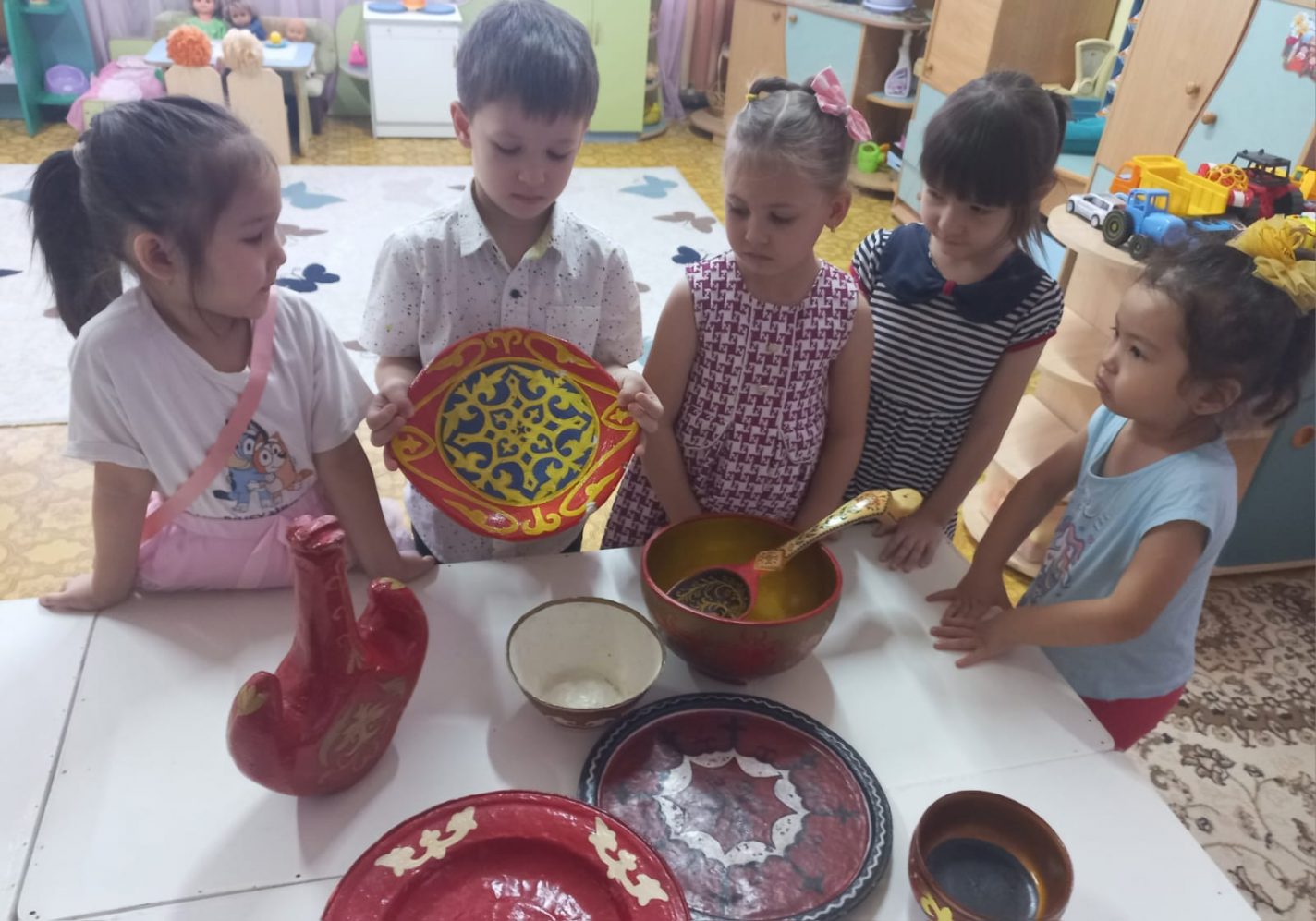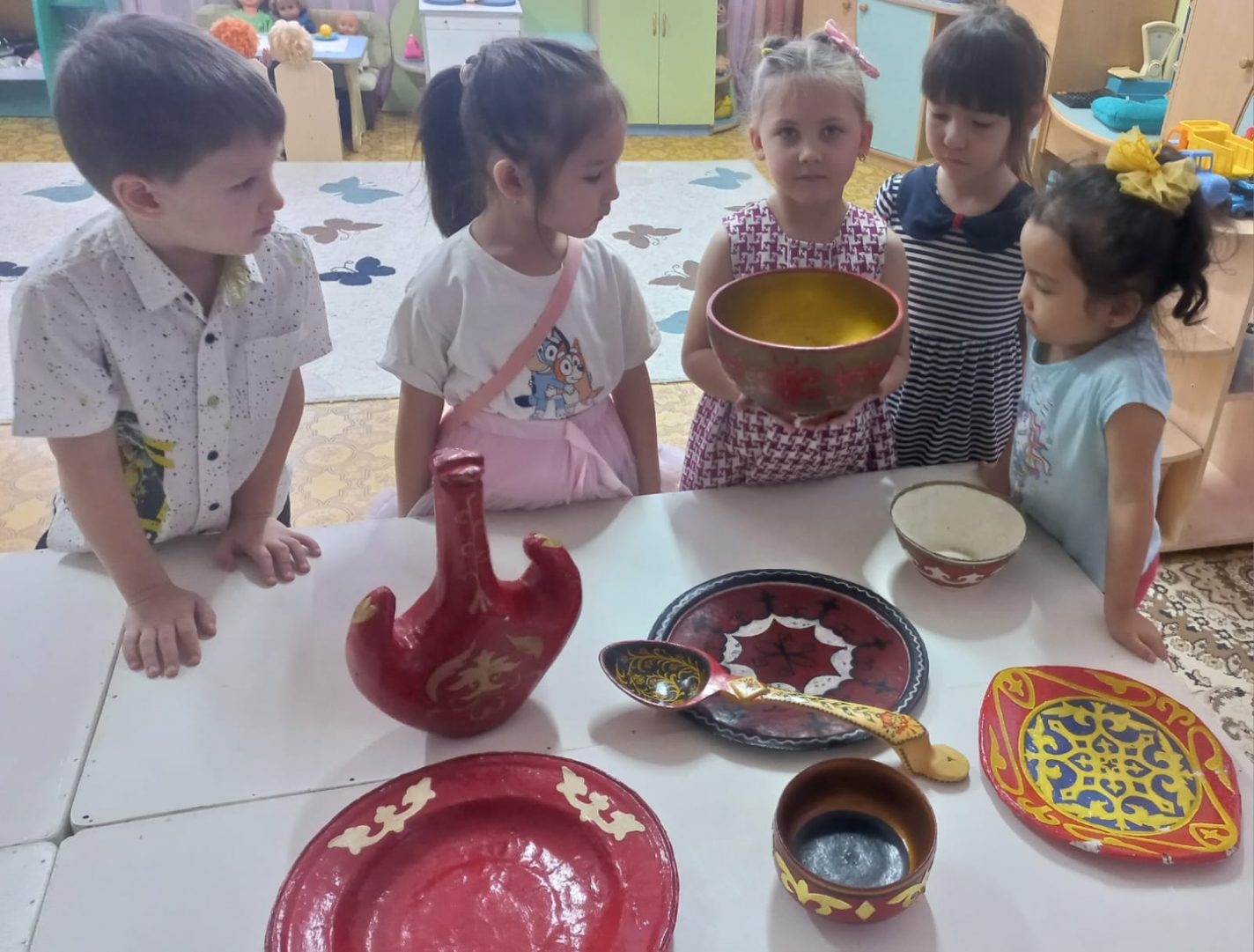 Балалар ұлттық ыдыс түрлері туралы білімдерін бекітті, қазақтың ұлттық ою-өрнектері бар альбомдарды қарады, ыдыс-аяқтың силуэттерін "тышқан ізі" (тышқан ізі) қазақ ою-өрнегінің элементімен безендіруді үйренді. Олар "пиаланы безендіріңіз"дидактикалық ойынын ойнады. "Тілге бойлау" бағдарламасын жүзеге асыру аясында балалар қазақ тіліндегі сөздерді бекітті. Тәрбиеші Солдатова Татьяна Павловна.